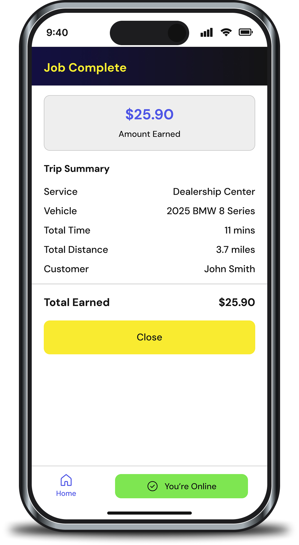 After driving the customer’s vehicle to the destination (often a service center or dealership), complete drop-off steps in the app, then continue your day.